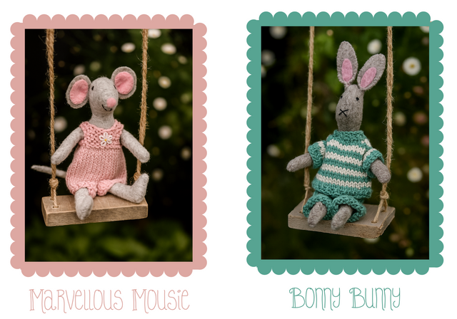 Make your own Marvellous Mousie and Bonny Bunny. The kit contains everything you need to sew your own little animal using beautiful pure wool felt and then knit them a perfect little outfit.